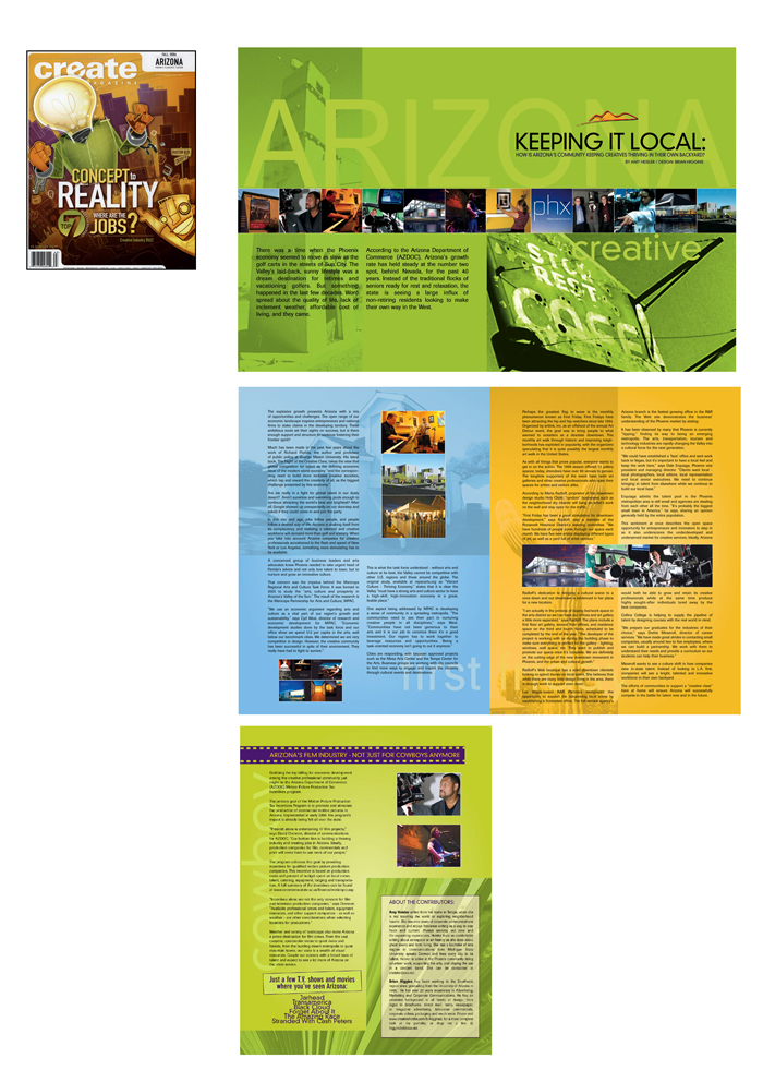5 page spread for CREATE magazine 2006 Fall Arizona edition. Create magazine asked us to participate in a co-op marketing campaign that features local writing and design talent to write and design key components of the CREATE magazine issue. This feature is about arizona film artists and festivals, images include those supplied by CREATE magazine as well photos shot by Spellbound Creative.