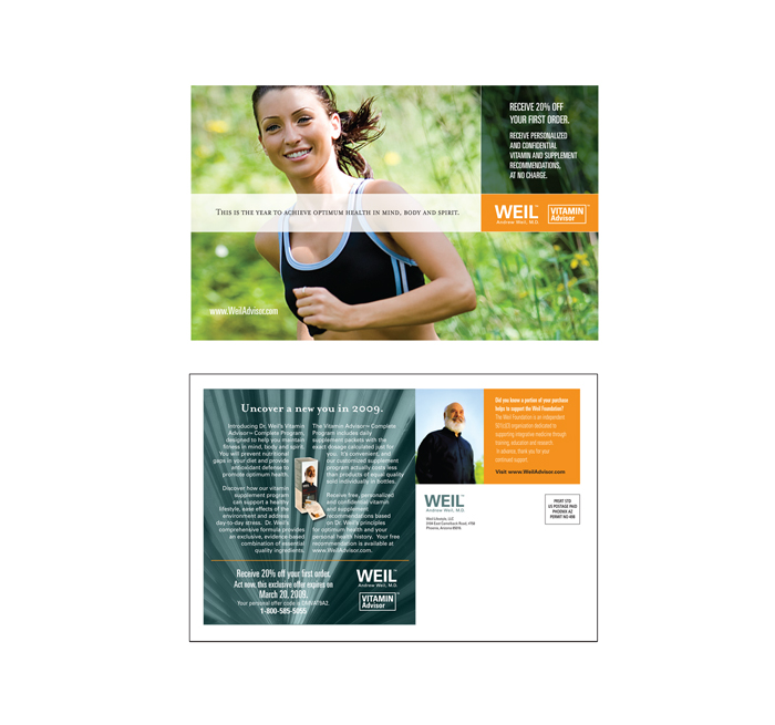 Direct Mail Campaign for Dr. Andrew Weil's Vitamin Advisor Program. This was the third of a series of postcards promoting a daily supply of supplements tailored to each individual that was validated through communications with a medical practioner and an online survey. The aim was to incorporate some of the 'natural' elements that Dr. Weil's philosophy is based.